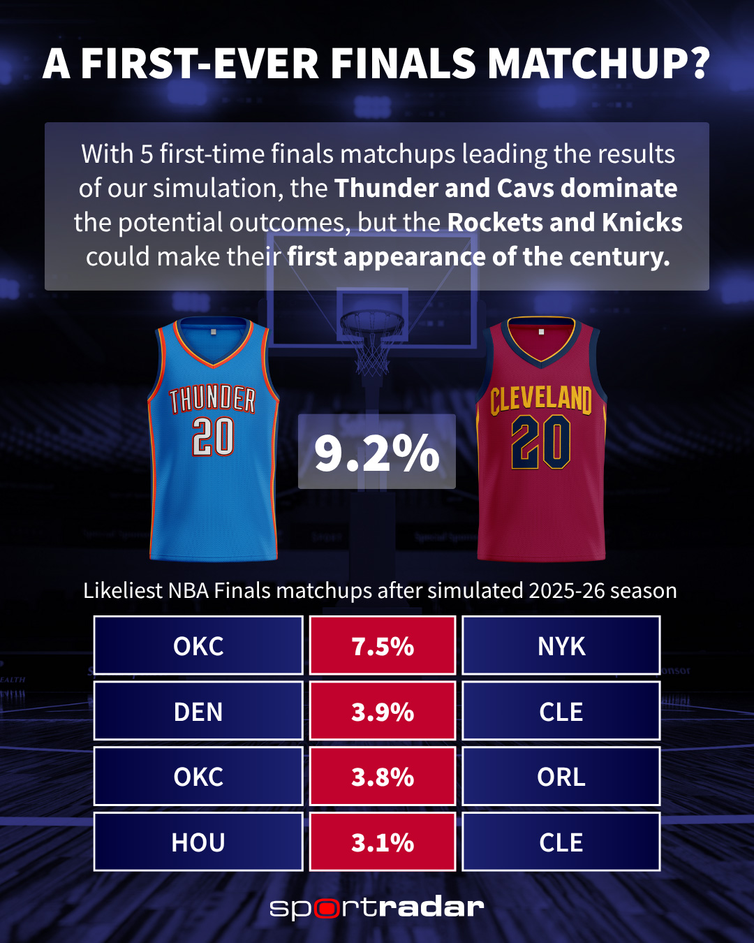 After running its regular season and playoff simulations, Sportradar projects the five most likely NBA Finals matchups, led by the Cleveland Cavaliers vs. Thunder at 9.2% probability. Of the five scenarios, the defending champion Thunder and Cavaliers appeared in three matchups while the Denver Nuggets, Houston Rockets, Orlando Magic, and New York Knicks were featured in one matchup apiece.