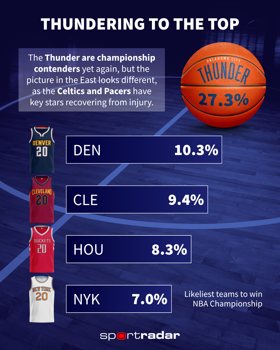 Sportradar’s simulation projects the Thunder are the most likely team to win the 2026 NBA Finals, as they were crowned repeat champion in 27.3% of the 50,000 simulations conducted. Behind Oklahoma City, the Nuggets (10.3%) and Cavaliers (9.4%) were the next most likely teams to win the NBA Finals, while the Rockets (8.3%) and Knicks (7.0%) each earned strong odds to capture their first championship in 30 and 52 years, respectively.