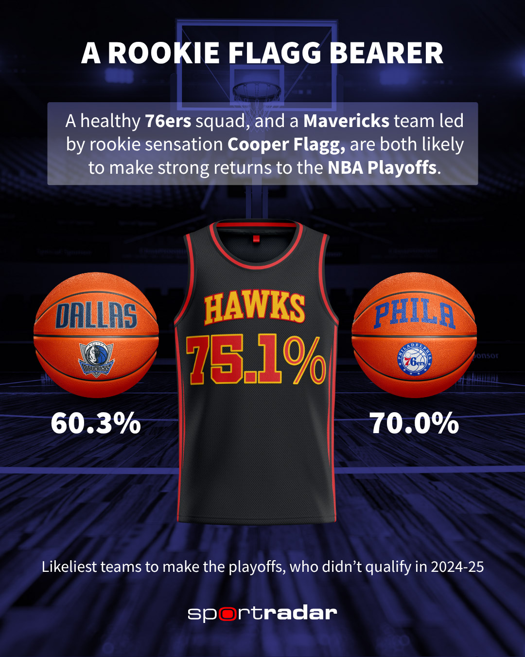 In doing so, the simulation projects three teams that are most likely to return to the playoffs after missing out last season: the Atlanta Hawks (75.1%) and Philadelphia 76ers (70.0%) in the East, and the Dallas Mavericks (60.3%) — led by 2025 No. 1 overall pick Cooper Flagg — in the West.