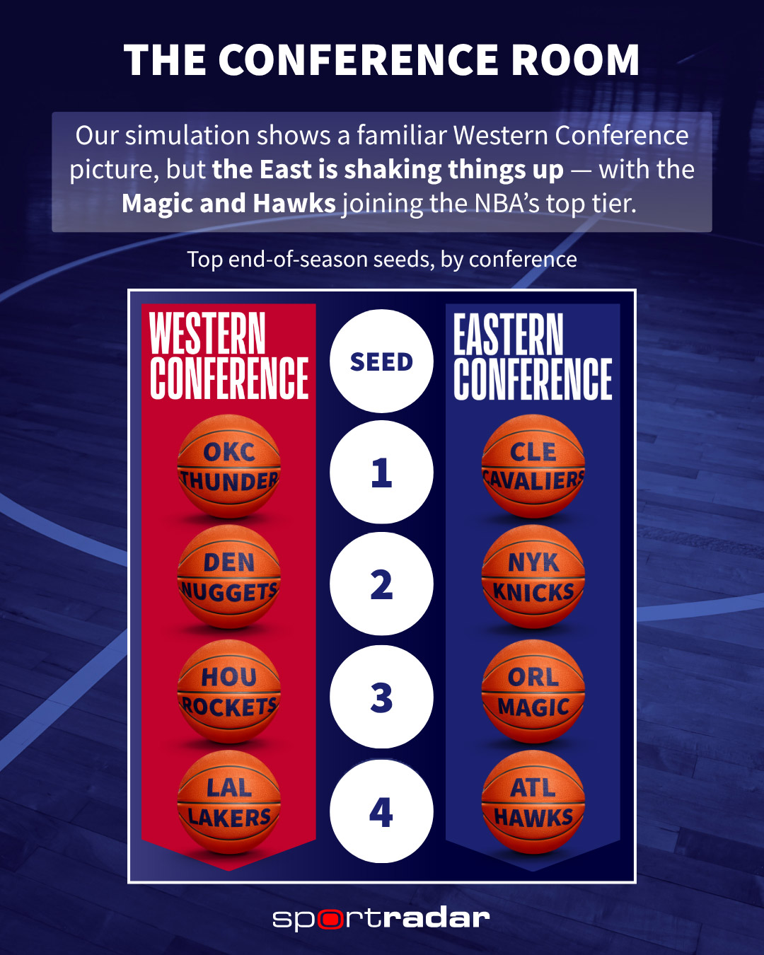 Sportradar’s simulation also projected the Eastern and Western Conference standings, highlighting the most likely teams to earn top four seeds and home-court advantage in the playoffs.
