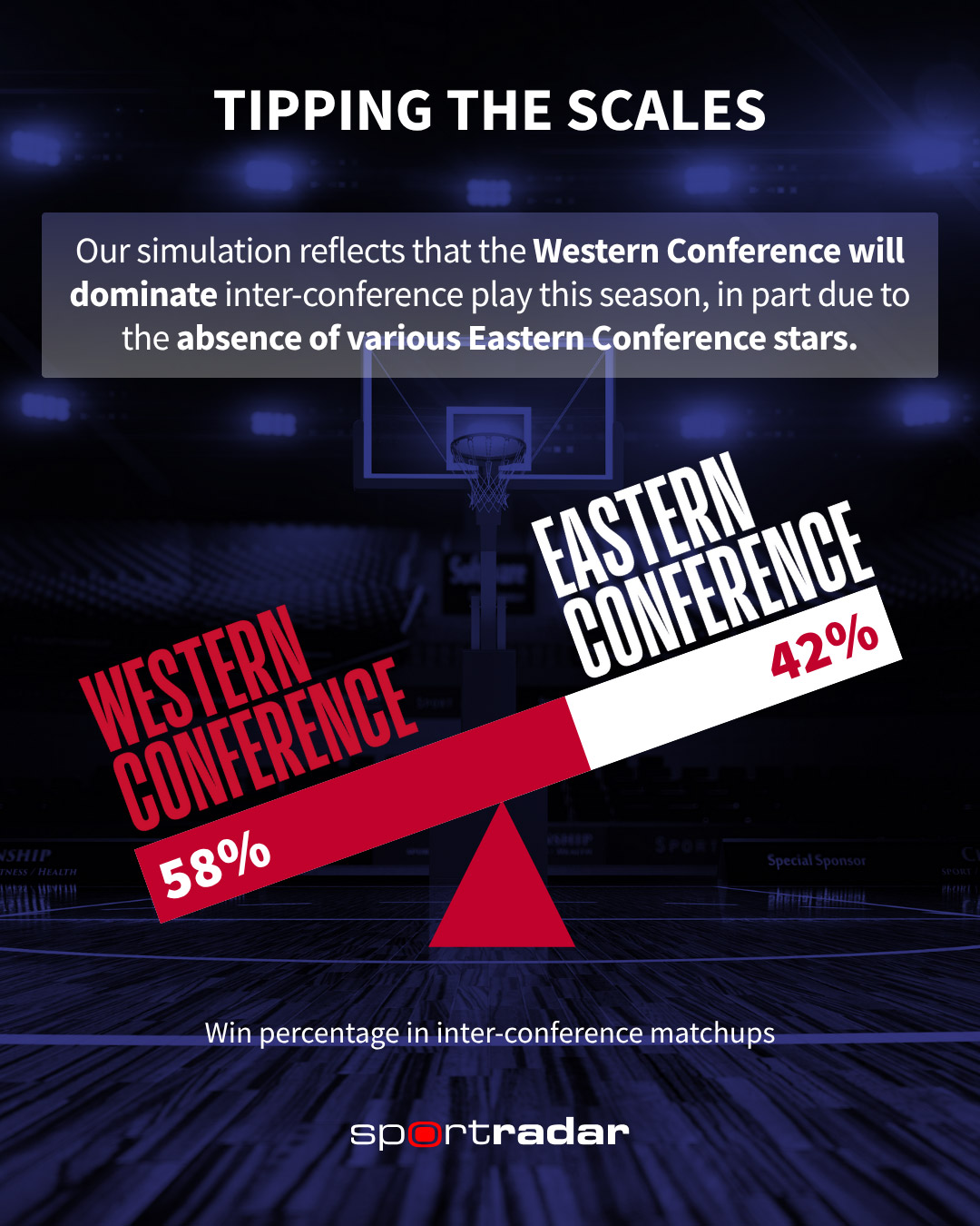 Sportradar’s AI-powered simulation also projects the Western Conference to be stronger than the Eastern Conference this season, with the West taking 58.0% of all inter-conference matchups played during the regular season.
