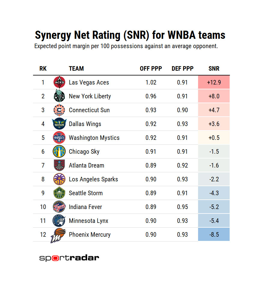 For example, here are the 2023 end-of-year Synergy Net Ratings for the 12 WNBA teams.