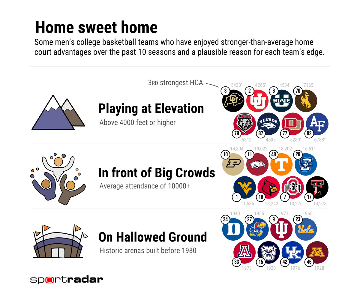 Like the NBA’s Denver Nuggets, college teams who play at elevation enjoy a physiological advantage over their opponents. Games played above 4,000 feet leave opponents gasping for thin air, a phenomenon which has helped several high-altitude teams to establish above-average home court advantages, including Colorado (5430’), Utah (4265’), and Utah State (4534’) who are each in the Top 10 for biggest HCA according to our model.