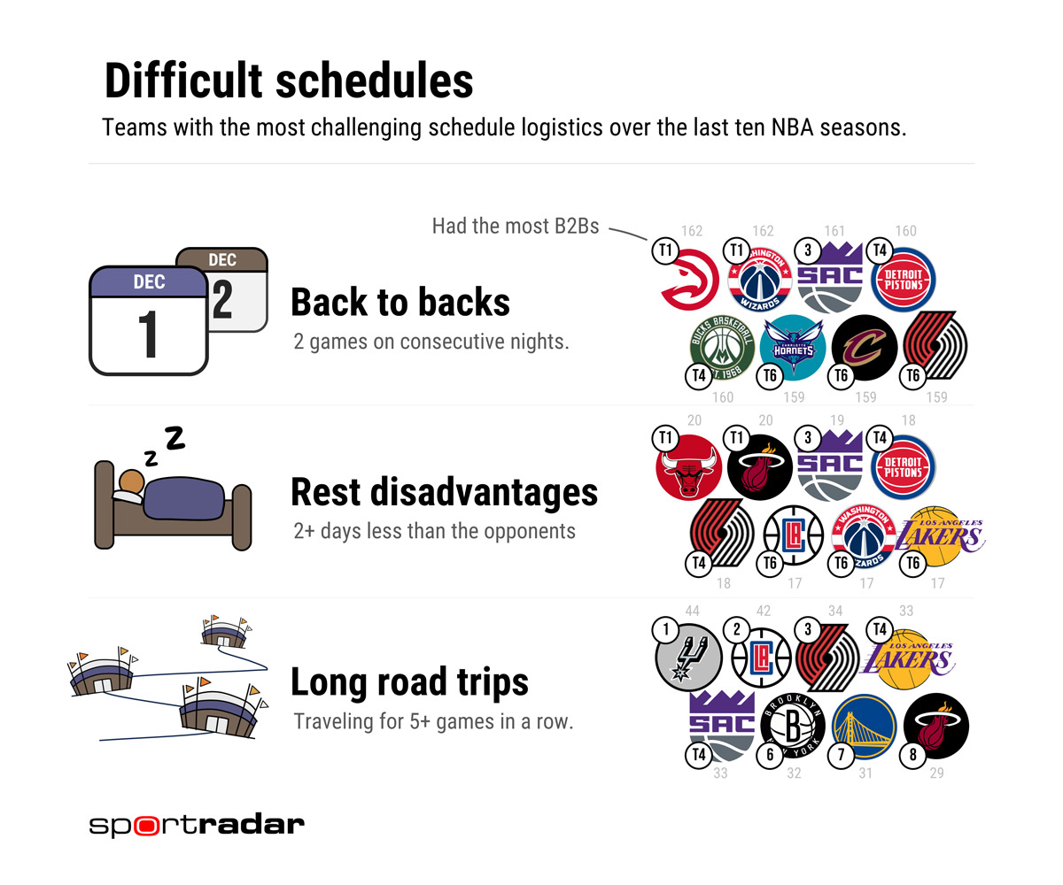 Crucially – due to the serious logistical challenges of scheduling 1230 regular-season games for 30 teams across 28 cities while avoiding concerts and hockey games and all the other arena commitments that the schedule makers must accommodate – these types of rest disadvantages aren’t necessarily distributed equitably around the league. Teams can have difficult stretches of weeks (or even longer) during which their travel and rest difficulties are more challenging than the situations their competitors are facing.