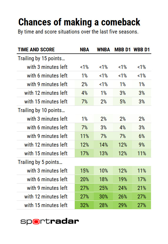 One thing that is clear is that the chances of a team making a comeback in various situations of time and score will vary by league. For example, a team who is trailing by 10 points with 9 minutes left in an NBA game is in a tenuous but not insurmountable position. Over the last five years, NBA teams who have found themselves in this situation have mounted a successful comeback 11% of the time whereas college women’s teams have had about half as much success overcoming that same type of deficit (just a 6% comeback rate). Because the probability of making a comeback varies by league, it follows that a coach’s approach to conceding defeat will also vary by league.