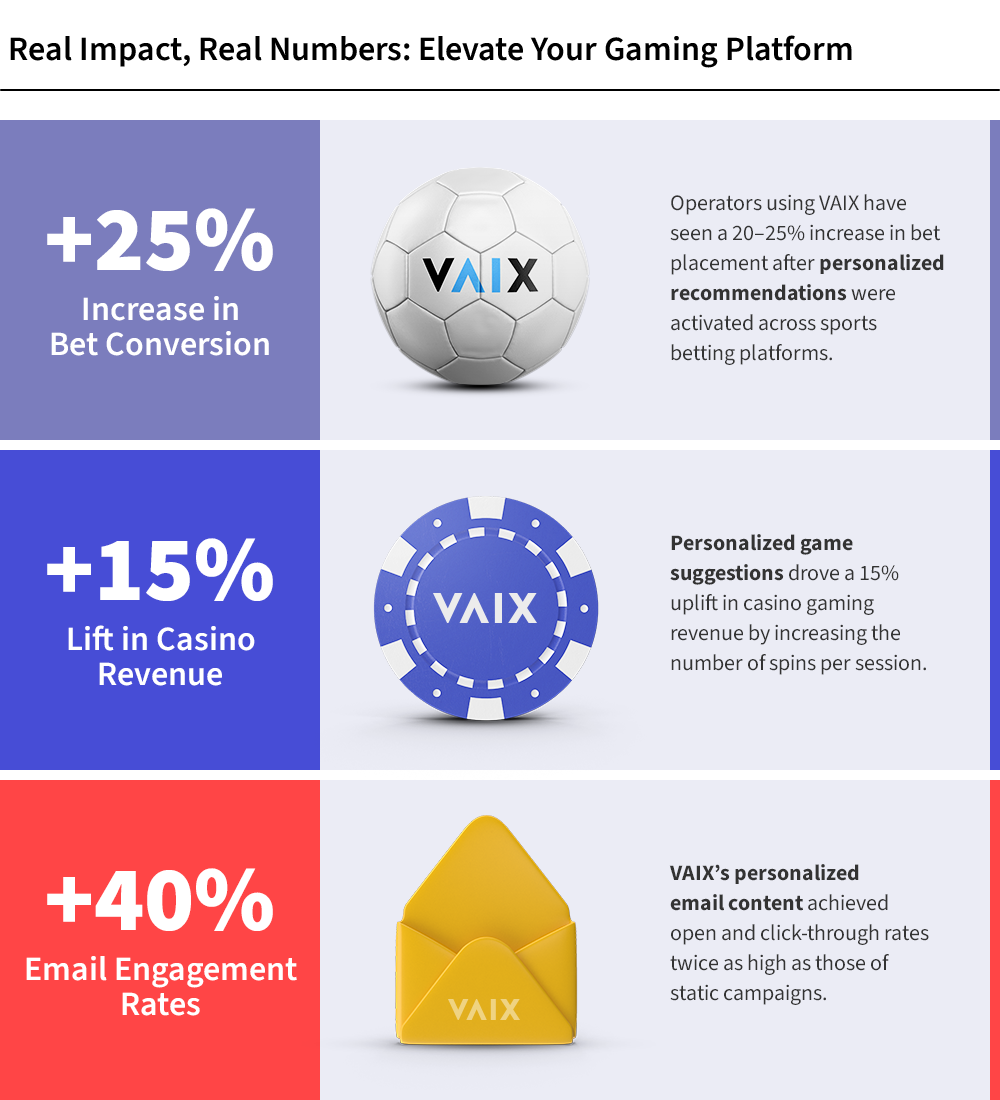 Example: A casino using VAIX personalized game lobbies based on player history. Slot sessions increased by 23%, and game abandonment dropped significantly.